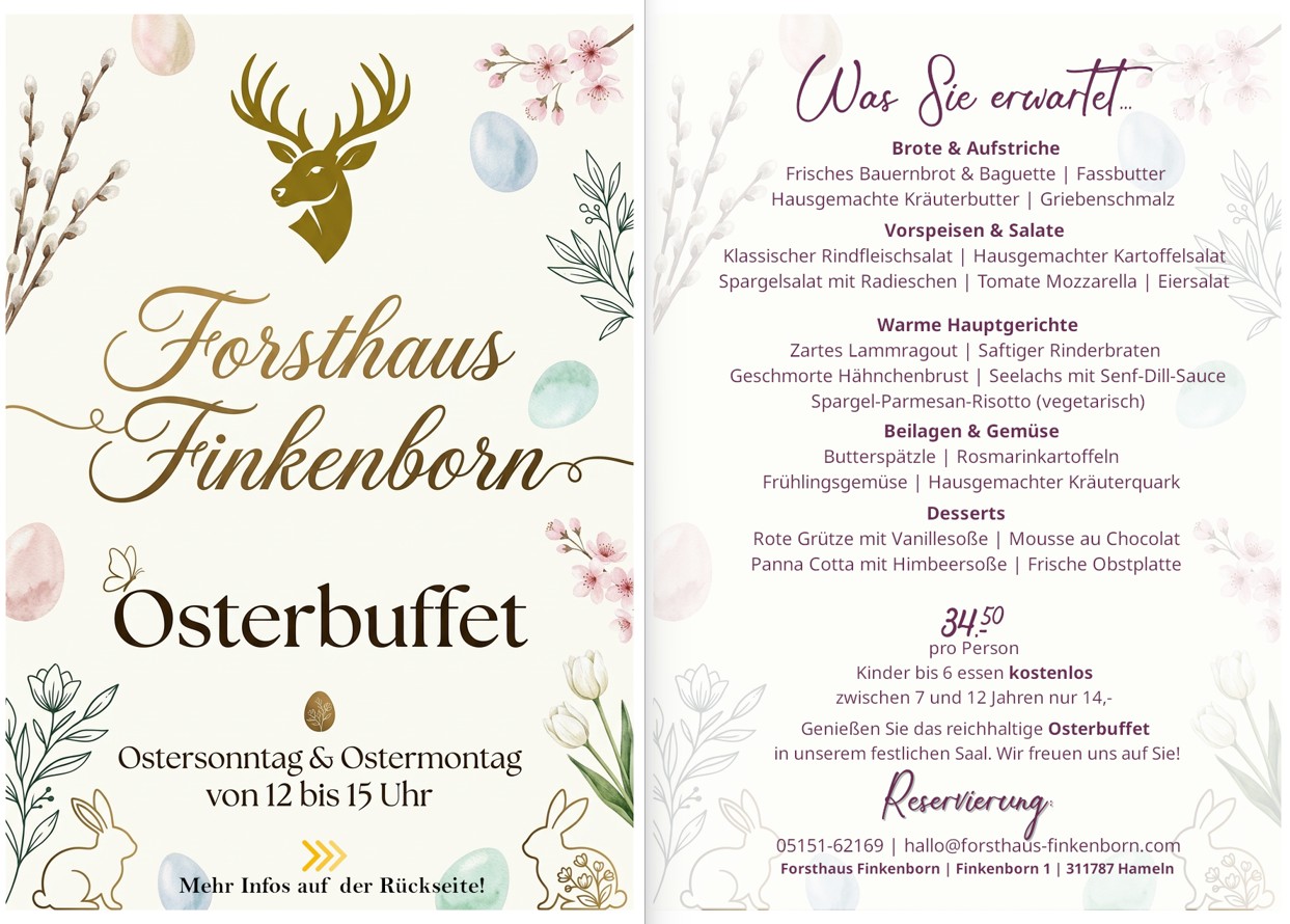 nach dem Eigentümerwechsel im Jahr 2021 begann für das Forsthaus Finkenborn ein Dornröschenschlaf, aus dem das altehrwürdige Gemäuer in der einmaligen Natur des Hamelner Stadtwaldes vor kurzem erwacht ist. Im Jahr 2022 erfolgte die grundlegende Erneuerung der Inneneinrichtung, der Sanierung der Gasträume, des Kaminzimmers, des Thekenbereichs, der kompletten Küchen- und Schanktechnik, aller Nebenräume und sämtlicher Infrastruktur sowie des Außenbereichs. Deshalb freuen wir uns, Ihnen das Forsthaus Finkenborn in neuem Glanz präsentieren zu dürfen.